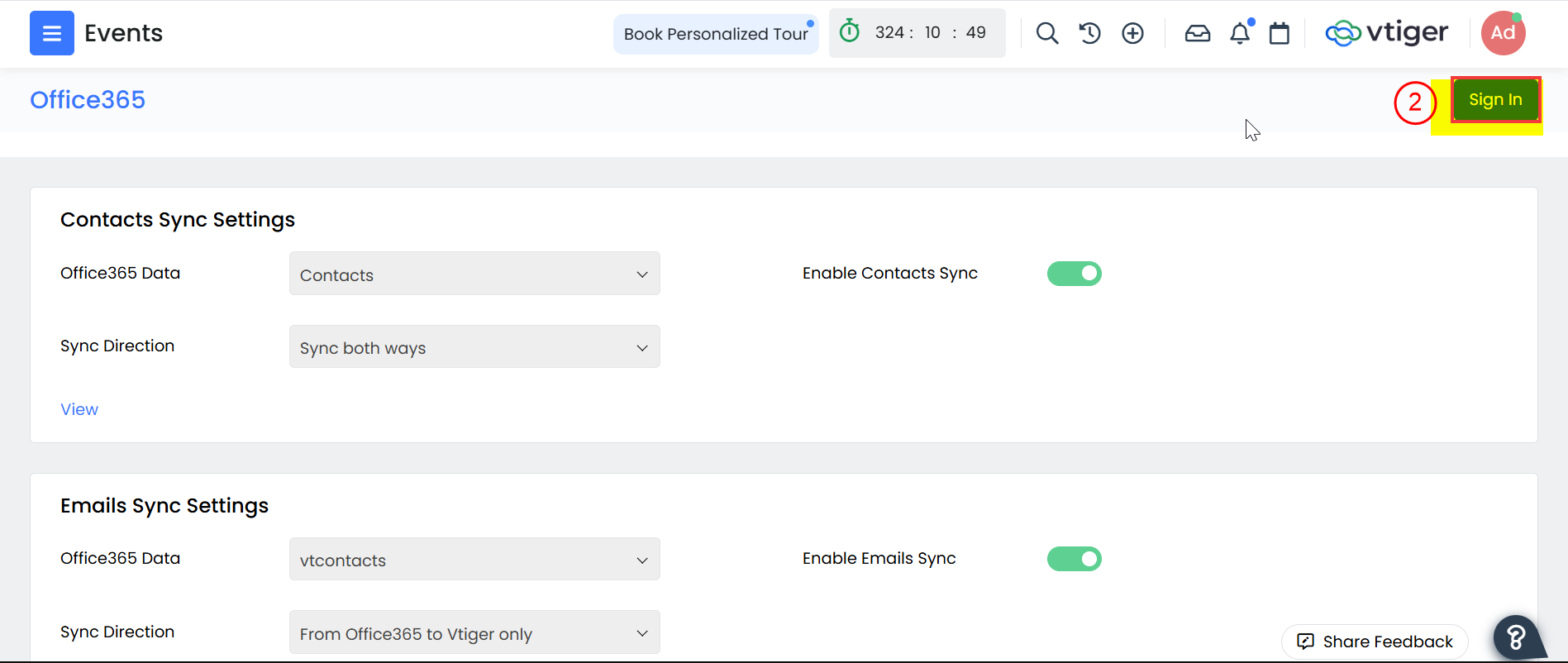 Before you can sync your contacts, emails, and calendar between Office 365 and Vtiger, you need to configure sync settings in the CRM. You can configure these settings either from the Contacts or the Events module.