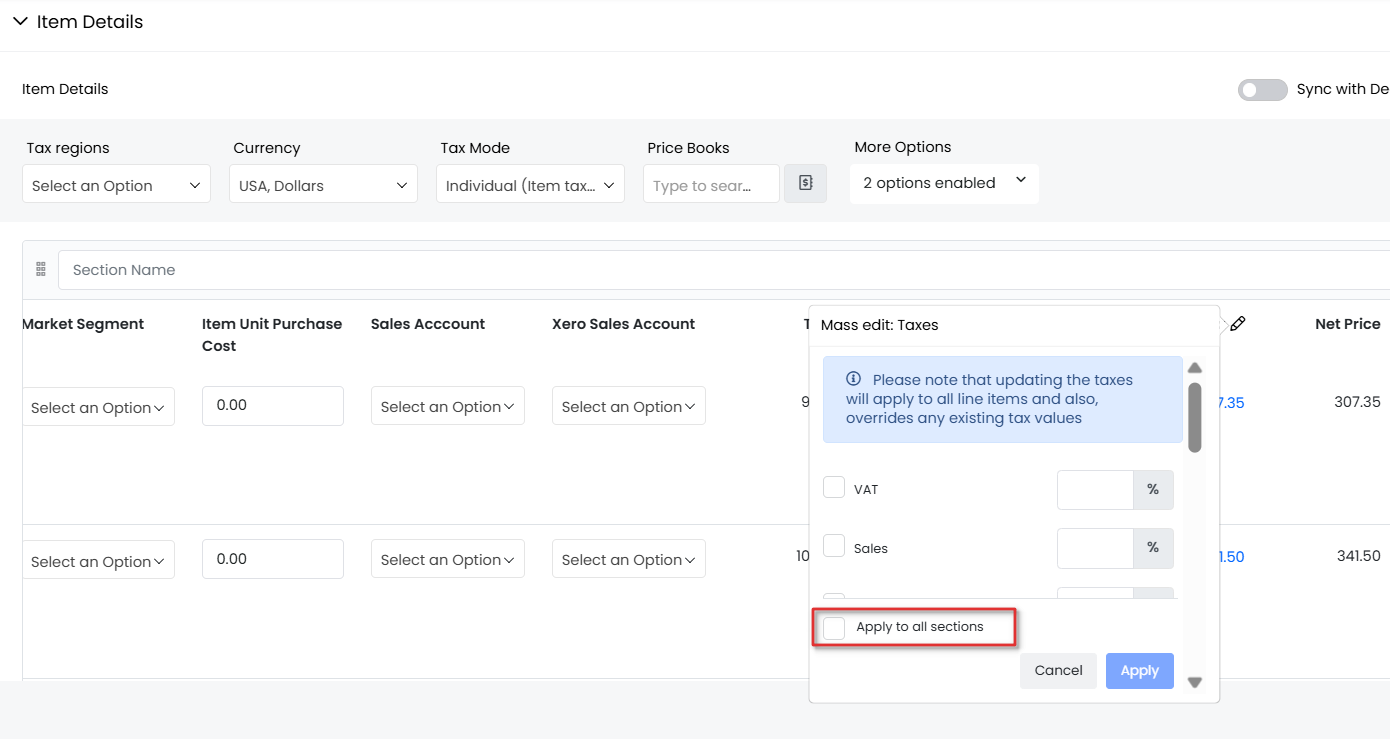 - Add Section: Click to add a new section to group related line items.