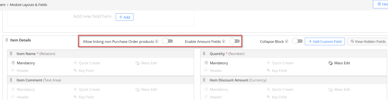 To display the Purchase Cost, you must enable the Amount Fields toggle in the Layout editor of Receipt Notes. The Purchase cost value in the Purchase Order will be copied to this field in RNs.