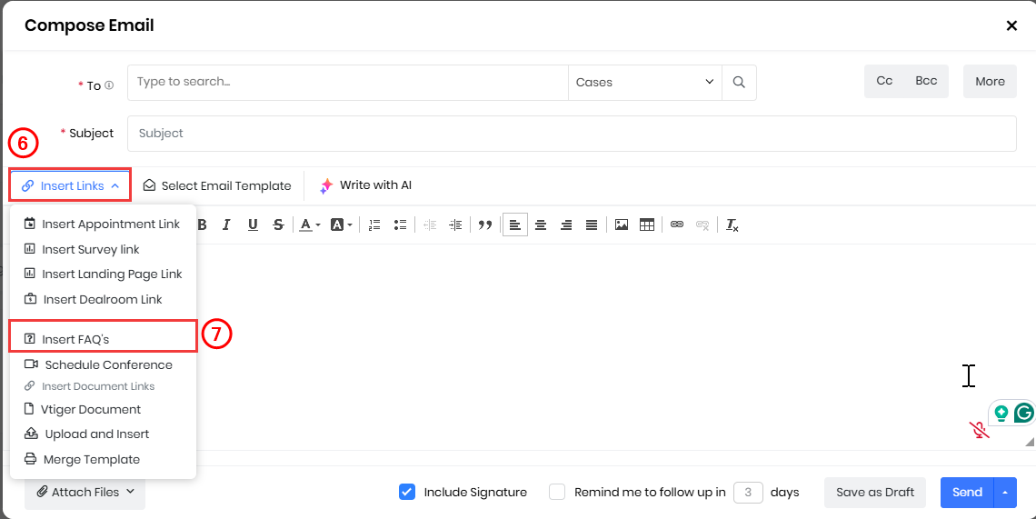 You can send FAQs while composing a new email, replying to an existing one, or responding to a specific case. For this example, we will send an email to a Case.