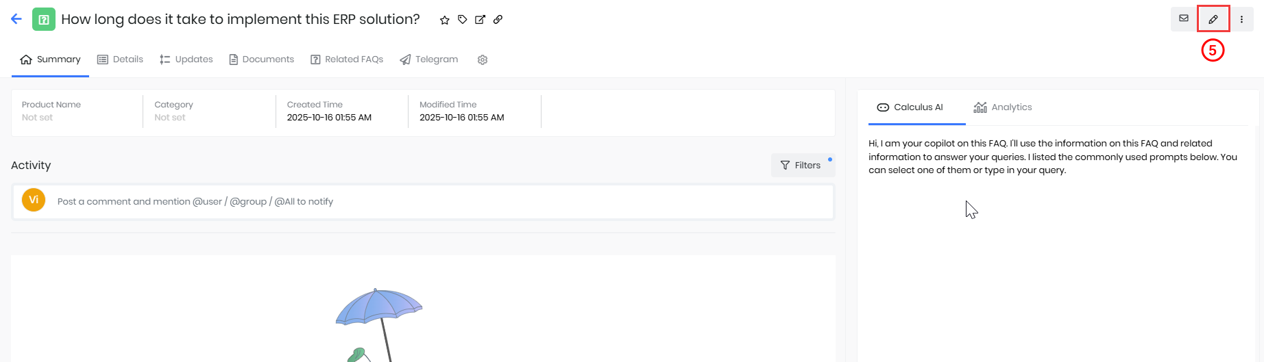 The Summary View gives you a detailed overview of an individual FAQ, presenting all essential information on a single page. In this view, you can review key details, such as the FAQ's status, associated product, category, and other metadata, depending on the module. You can also take action like editing the FAQ and changing its status from one convenient location.
