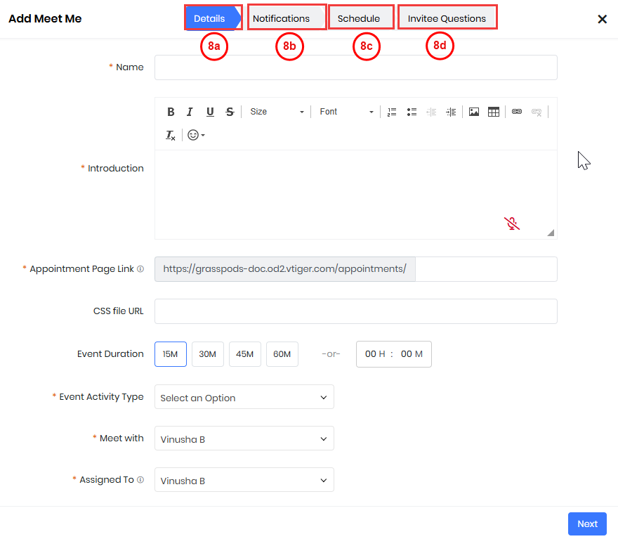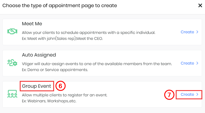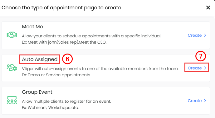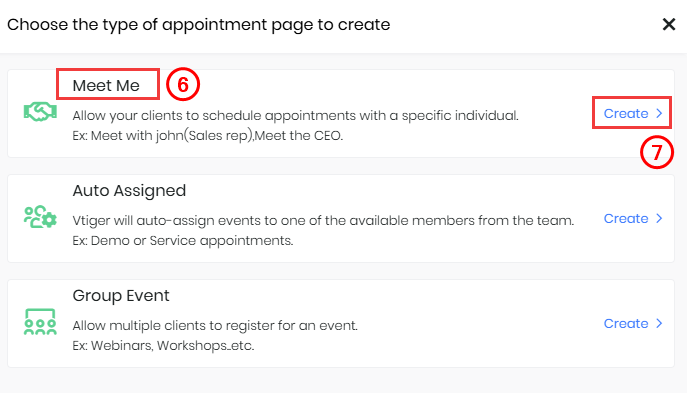 In Vtiger CRM, you can create three types of appointment pages – Meet Me, Auto-Assigned, and Group Event.