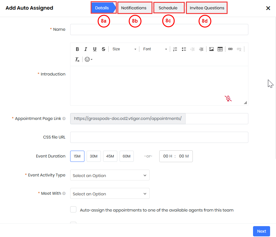 - Auto-Assigned Page: Auto-Assigned pages are assigned to a team/group. When the customer picks a date and time, Vtiger CRM automatically gives the meeting to a team/group member who is available to host the meeting, depending on his or her business hours.