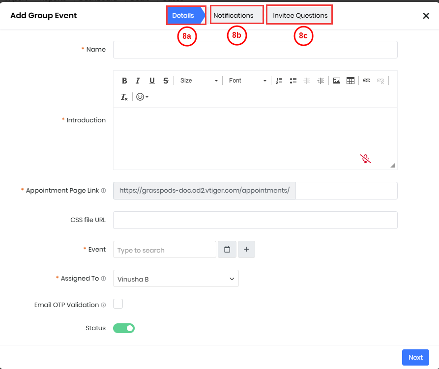 - You can add OTP validation while creating an Appointment, scheduling an Event, or a Group Appointment.