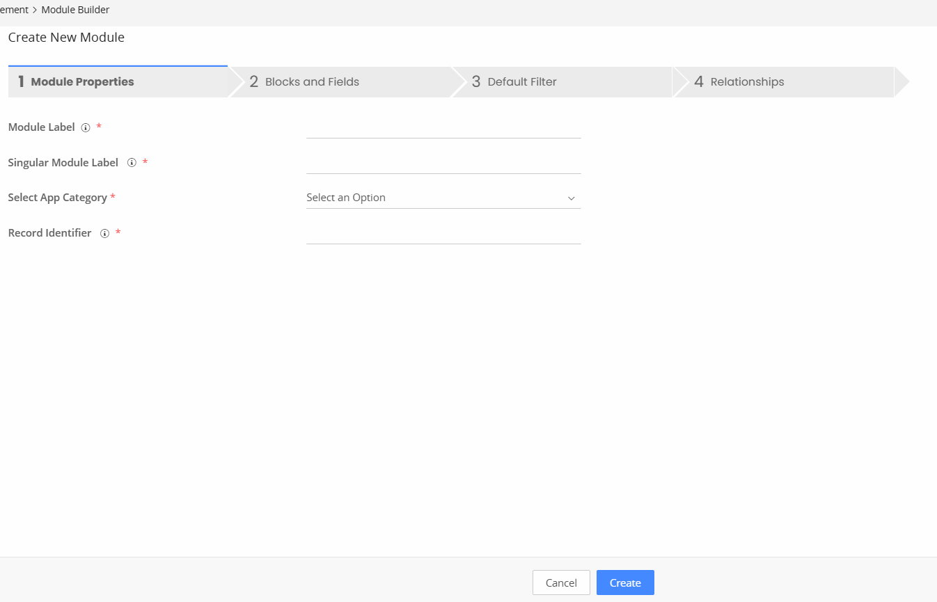 - Singular Module Label: Specify the module name in the singular form. For example, if the module name is Contacts, then Contact is its singular form. The singular form of Workforce is Workforce.