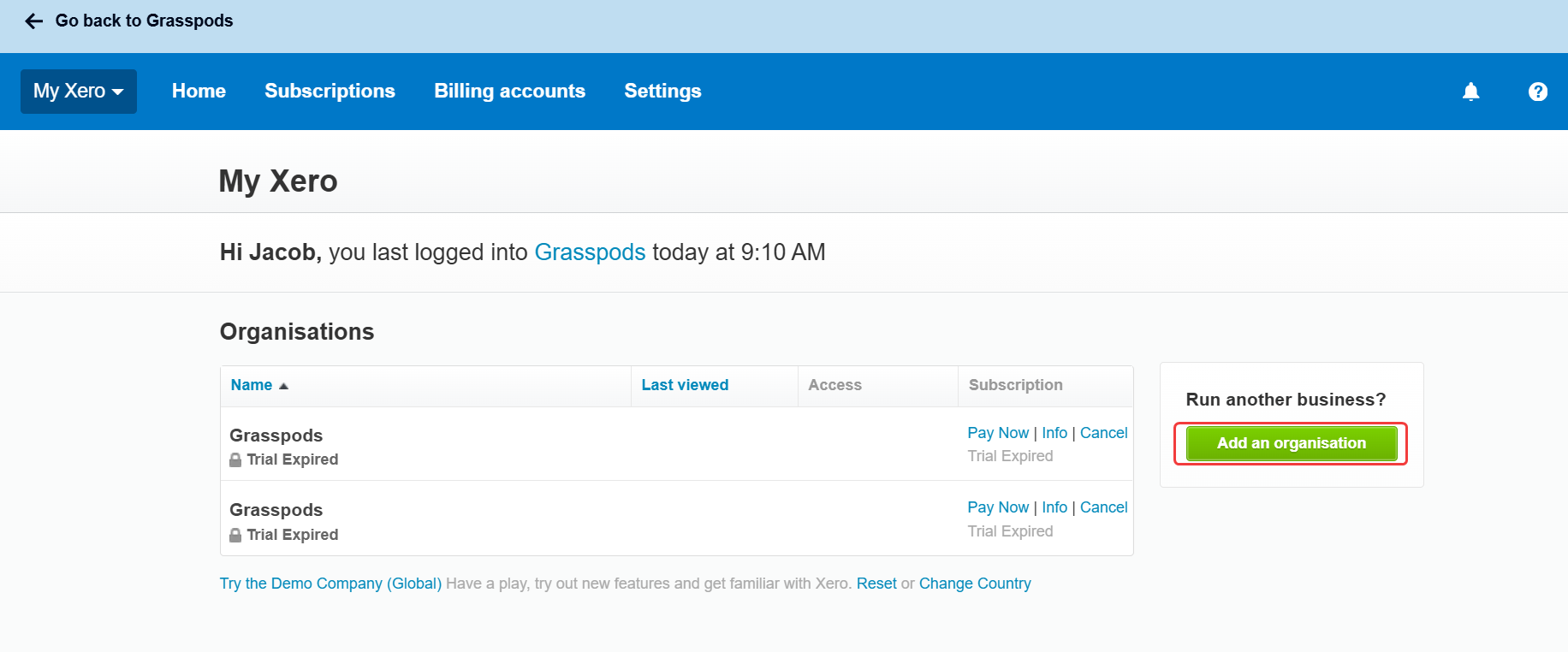 - Click Add an Organization to set up your business if you do not already have one in Xero.