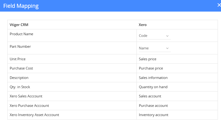 - If you map the Product name to the Item code, the Product name value in Vtiger will automatically be synced to the Item code value in Xero and vice versa.