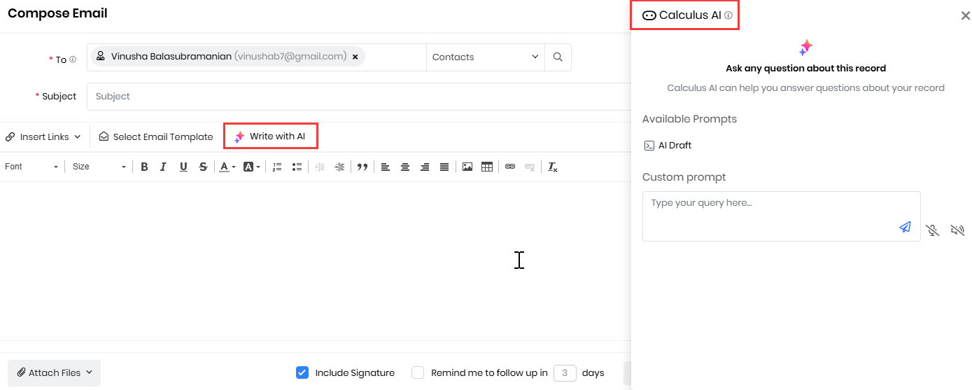 Generative AI in Calculus AI is designed to create new data, content, or insights by learning patterns from existing CRM information. It helps automate the generation of summaries, emails, reports, and other contextual data based on user input.