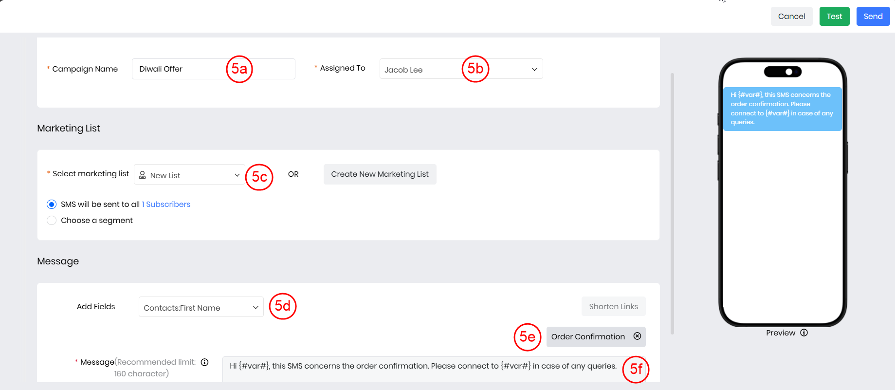 - Note: The recipient number is required only when sending a test message campaign.