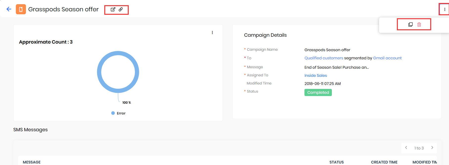 - Duplicate: Create a copy of the existing SMS campaign record for reuse or modification.