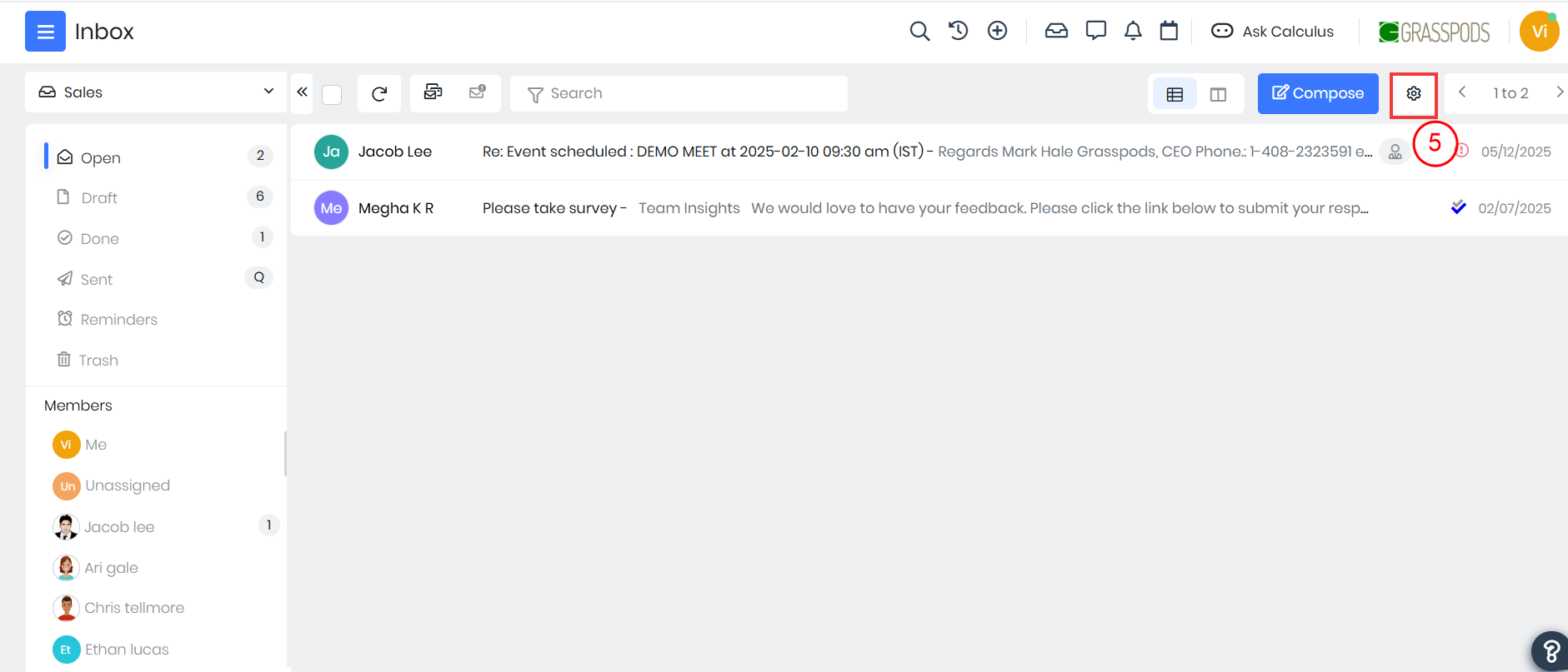 Your search for specific emails becomes easy with pagination in Vtiger CRM. You can find it located in the top-right corner above the email list.