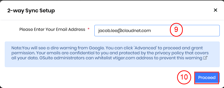 Users who haven't added Vtiger as a trusted application in G Suite will experience this problem. To resolve this, you'll need to whitelist Vtiger in G Suite.