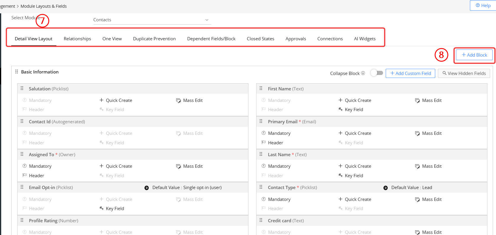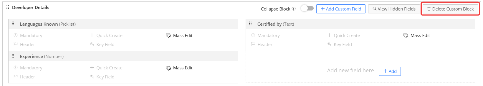 - Custom Blocks: Create new blocks in any module to organize related fields and enhance data organization.