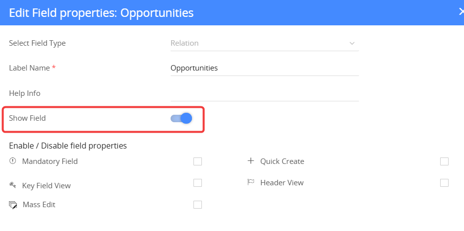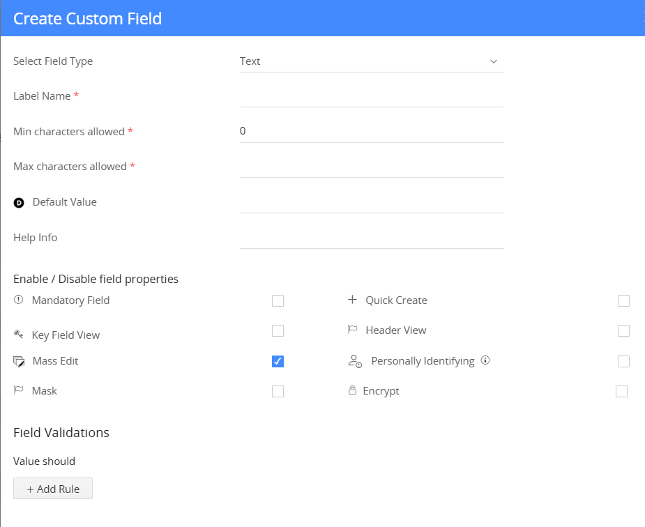 - Field Properties Configuration: Set rules like mandatory entry, quick create, key field, and more.