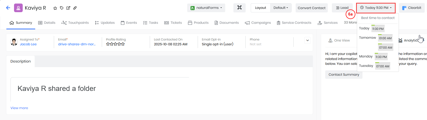 Note: The Best Time to Contact suggestions will only appear if the contact has past interactions recorded in their record.