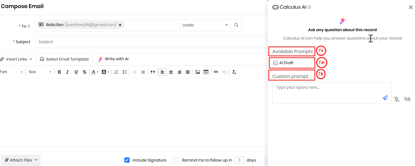 You can provide your own custom prompts or select from pre-saved prompts to get personalized, high-quality suggestions. This feature simplifies email writing, reduces manual effort, and ensures consistent and professional communication with leads and contacts.