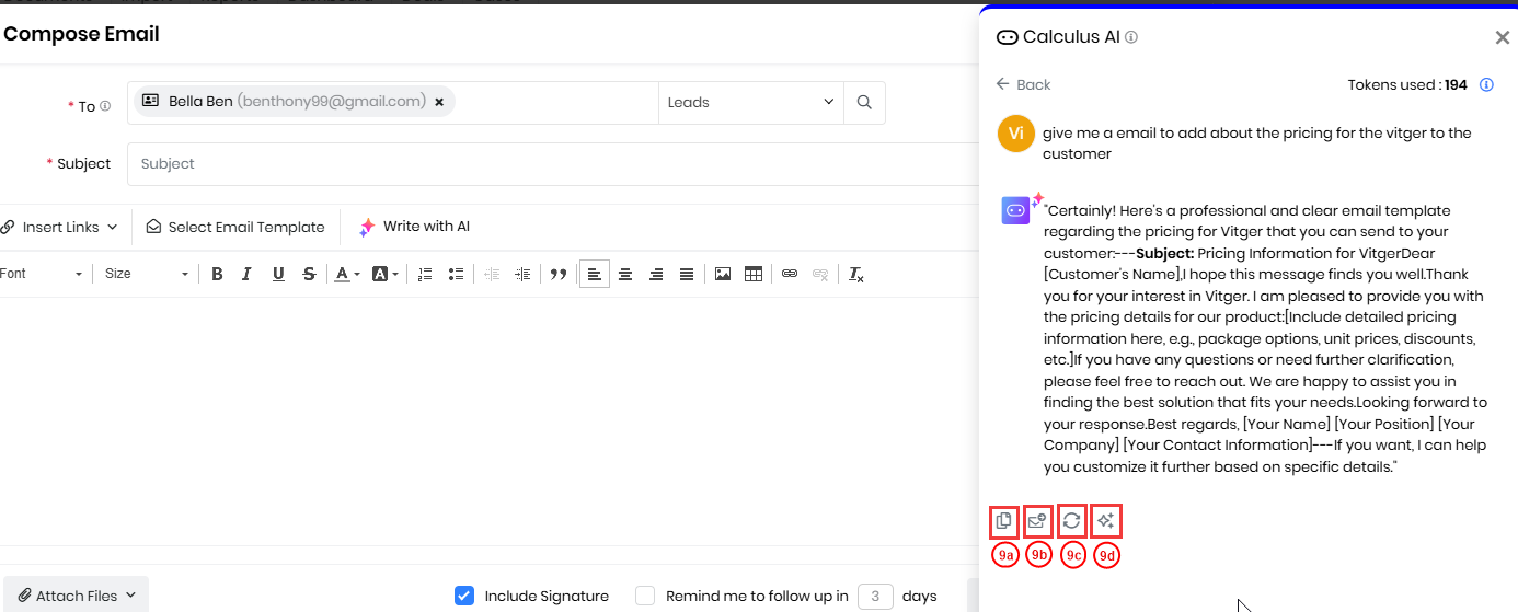 The Email Assistant in Vtiger CRM helps you compose emails faster and more effectively using Calculus AI. By analyzing your prompt, the assistant generates relevant, ready-to-use content.