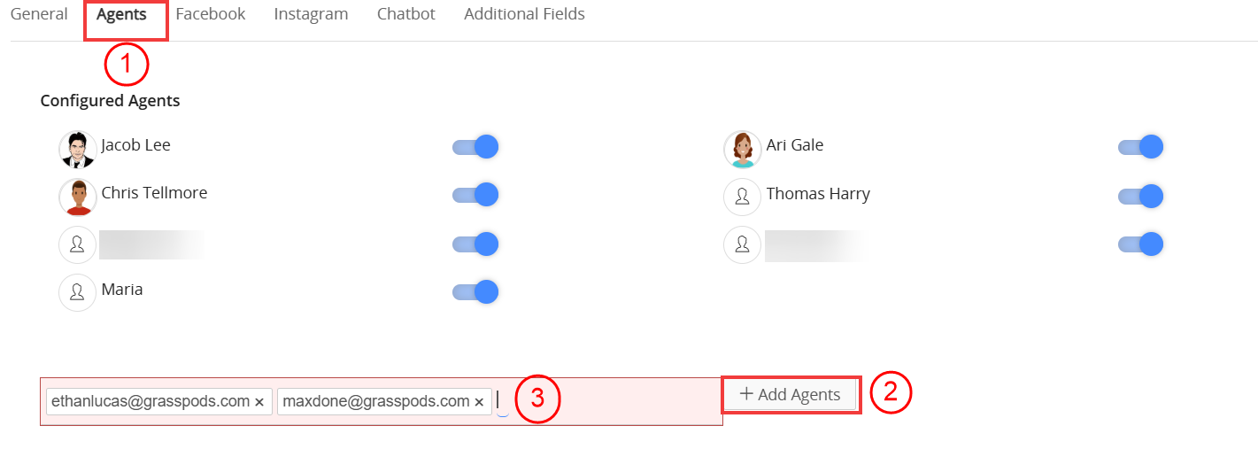 | Agents | Members of sales, support, and marketing teams who are well-versed in your business and will engage with the customers. |