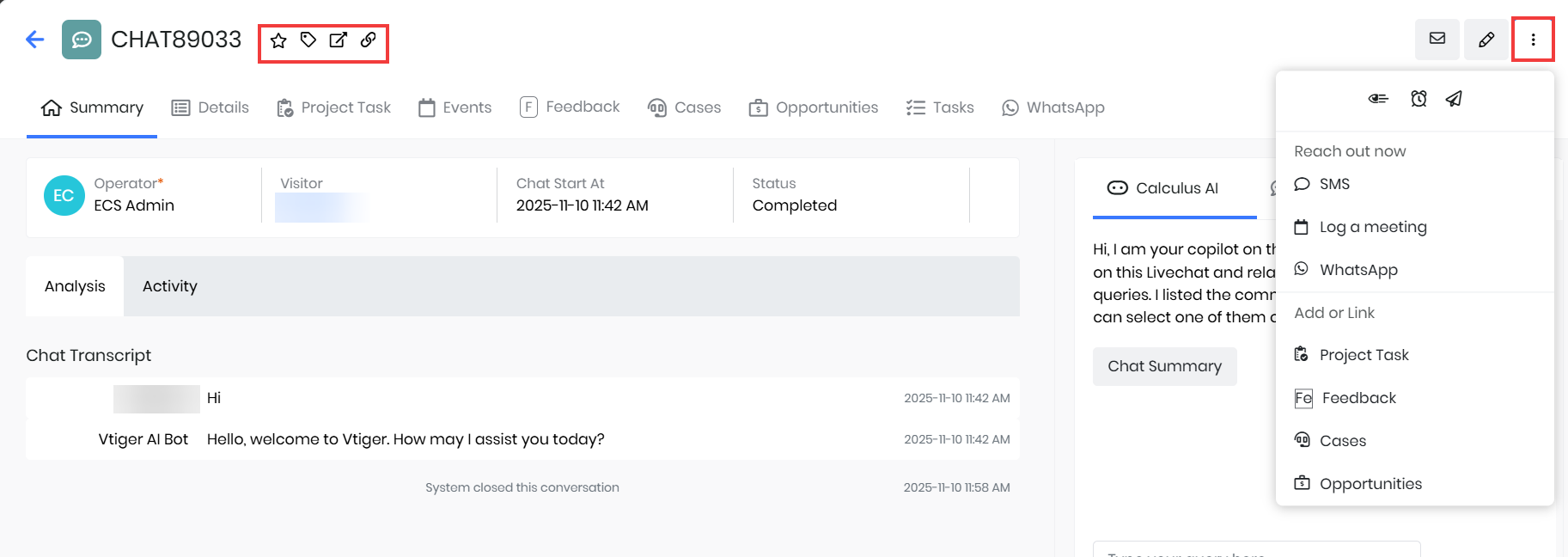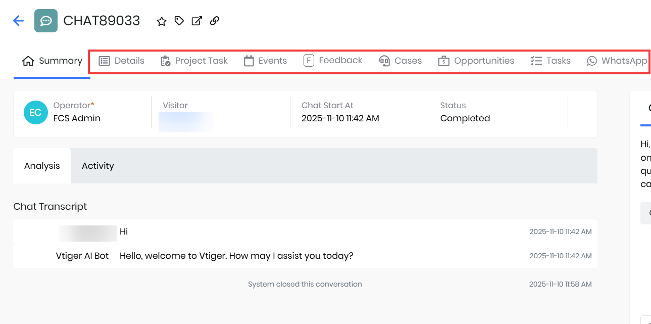 If you open the Summary View of any chat record, you will find an Analysis widget on the right open at all times. This widget shows a summary of the conversation. You can find the following in this widget: