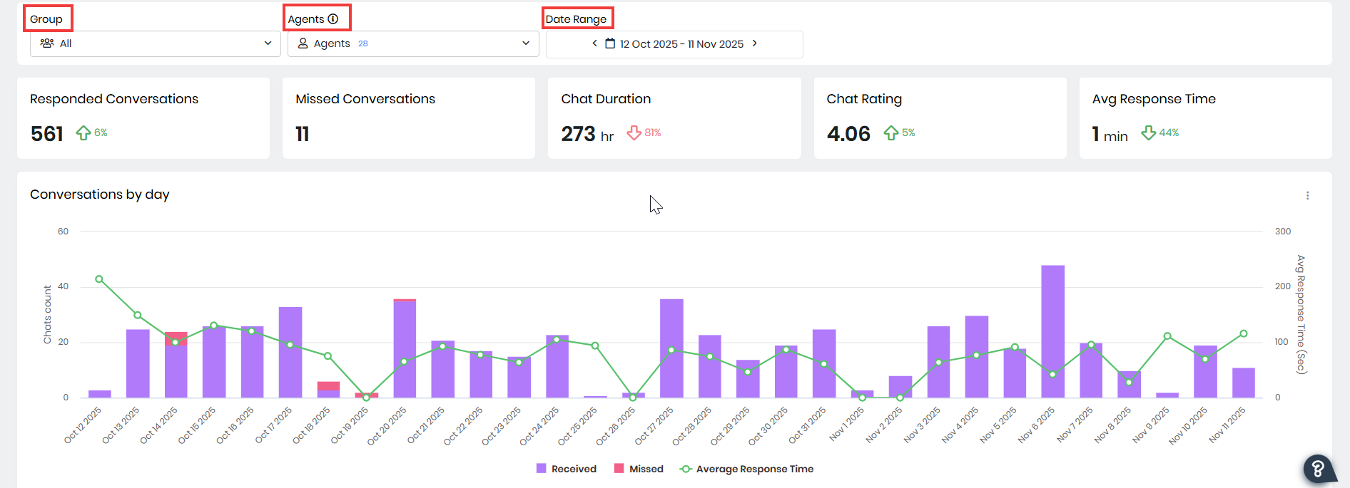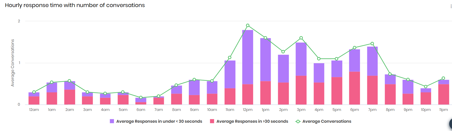 - Average response times by agent: Measures how quickly agents respond to customer messages.