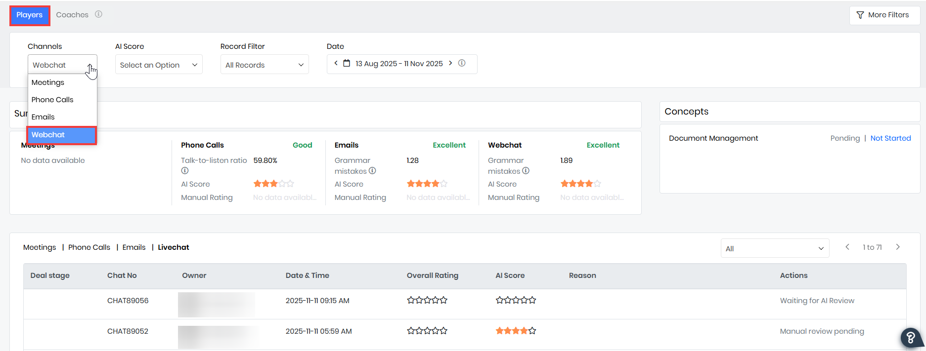 Metrics you generate will be available in the Coaching module. In the Coaching module, the Player Dashboard helps agents enhance their performance by providing insights into their Live Chat interactions. It allows agents to: