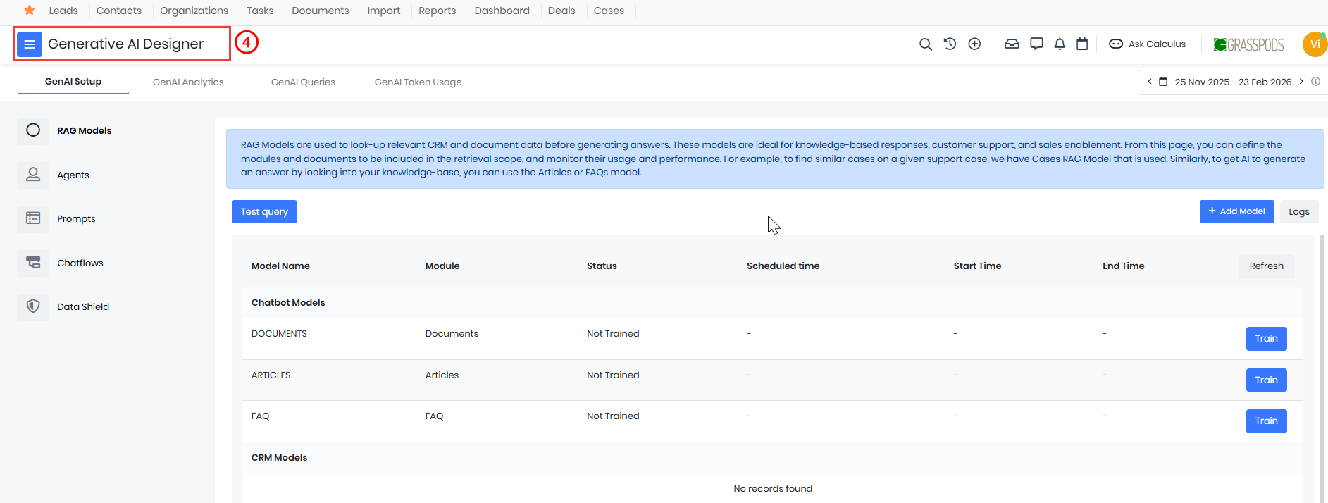 In Vtiger CRM, the Generative AI Designer serves as a centralized workspace for managing AI-driven interactions. It allows organizations to configure bot behavior, train AI models using CRM data, monitor performance, and manage user queries effectively. The module also includes controls to ensure secure handling of sensitive information.