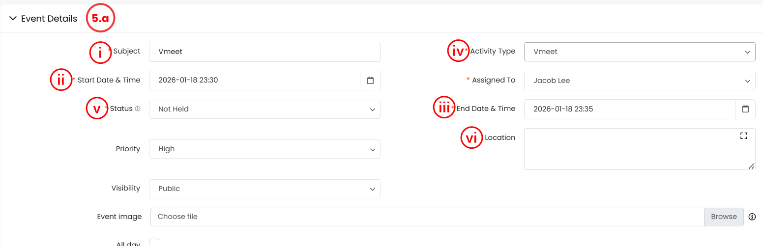 | Activity Type | The type of activity you can select for an event in the CRM. For example, Vmeet, Google Meet, Leave, etc. |