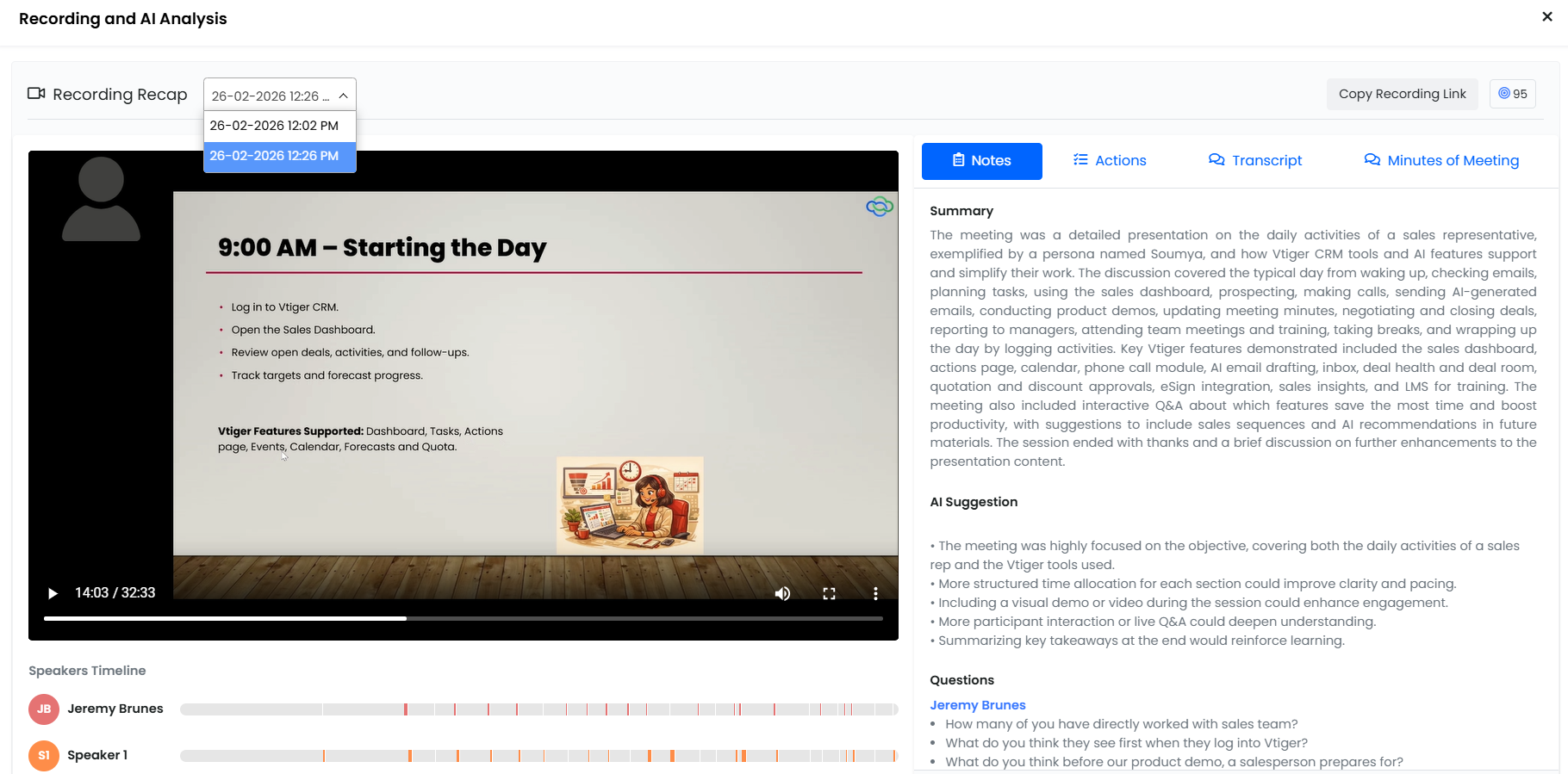 - Store meeting recordings and transcripts securely in Vtiger Documents for easy access and reference.