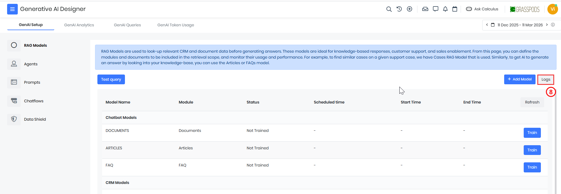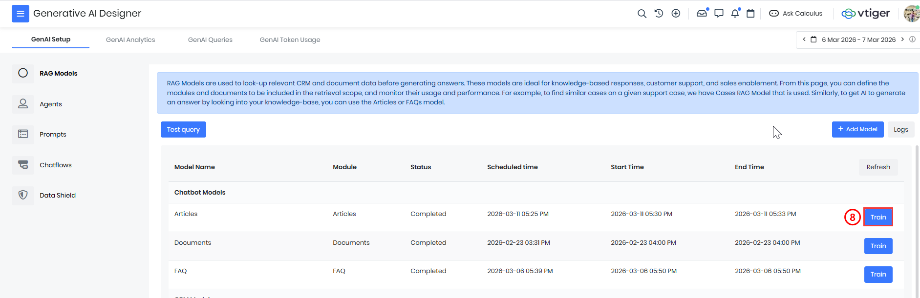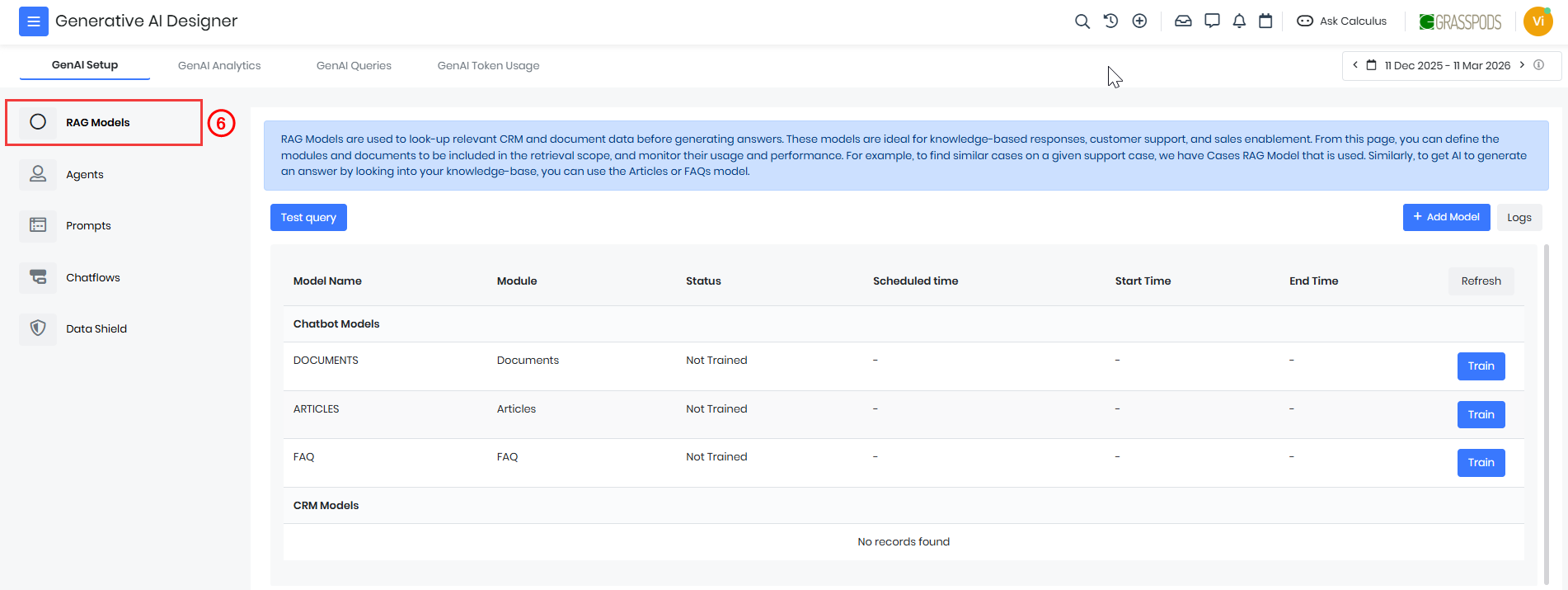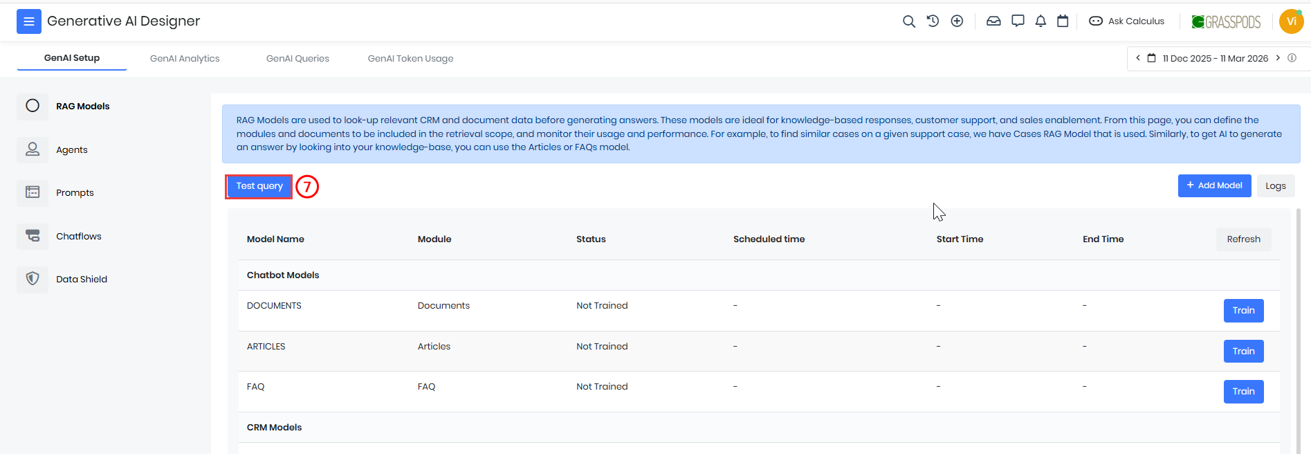 After training a RAG model, you can test it by running a Test Query. Testing helps verify whether the model retrieves relevant information from the selected CRM module.
