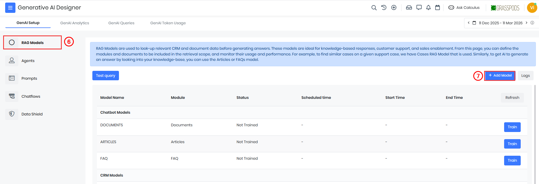 You can delete a RAG model if it is no longer required.Deleting a model permanently removes it from the system. Once deleted, the model cannot be recovered.Follow these steps to delete a RAG model: - Log in to the CRM.