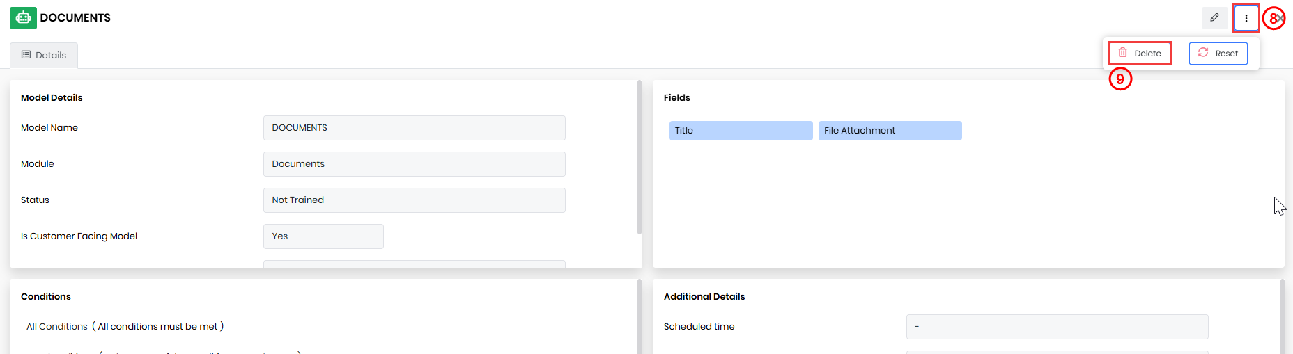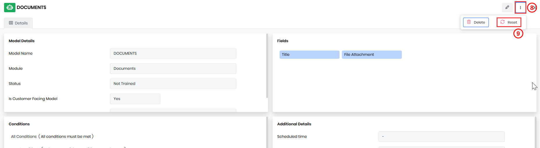 After resetting, the model training data is cleared, and you can train the model again.